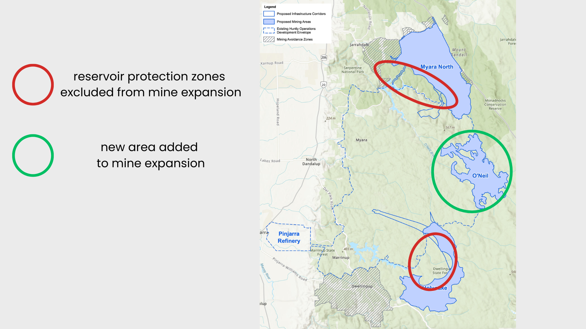 Alcoa's planned expansion of its sprawling Huntly mine involves extending mining to the north of Serpentine Dam in an area called Myara North and around South Dandalup dam at Holyoake.