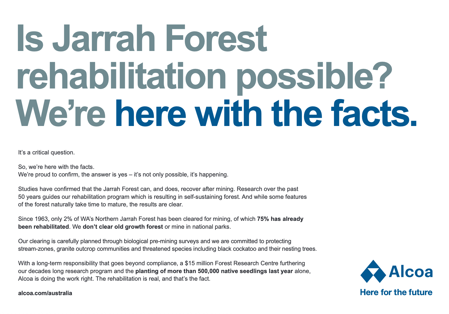 Despite this, in the past week, Alcoa has been advertising that "75 per cent has already been rehabilitated."