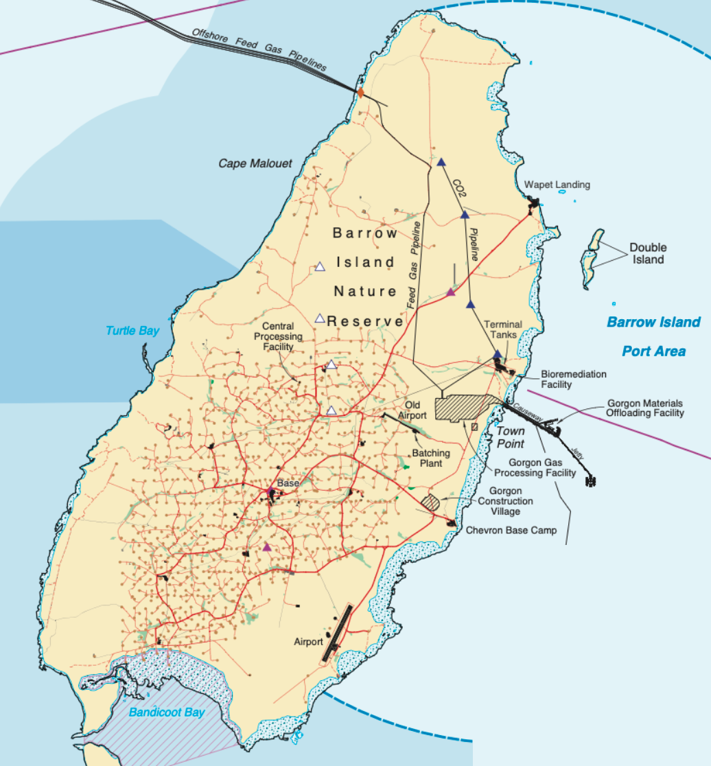 In May, the same month production ended, Chevron informed its regulator, the Department of Mining, Petroleum and Exploration (DMPE), that an unknown amount of gas was seeping to the surface near its old oil wells. The seeps add to widespread contamination of Barrow Island by Chevron.