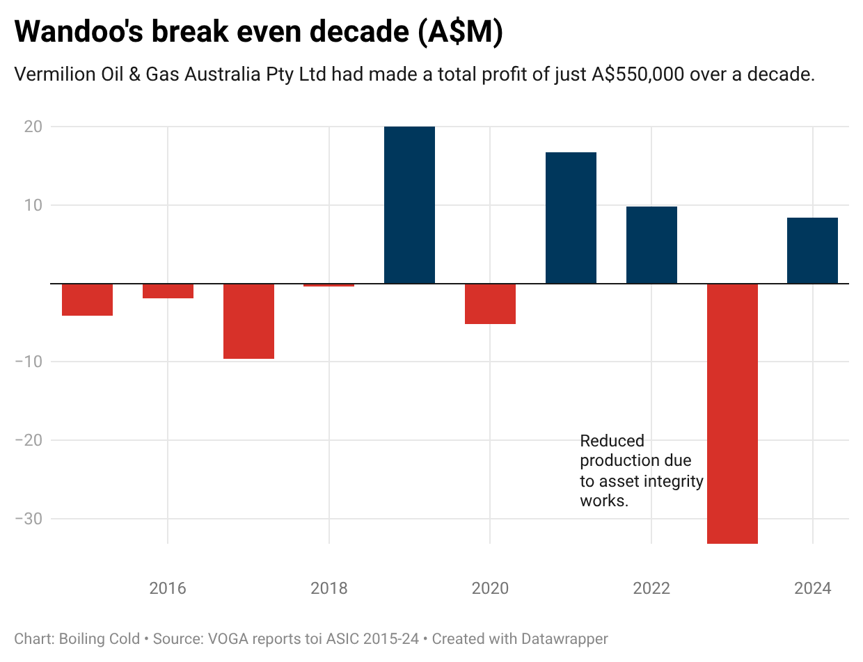 Vermilion Energy, slammed by Australia's offshore regulator NOPSEMA for repeated non-compliance with its environmental protection plan, has barely made a profit from its Wandoo oil field off WA over the past decade.